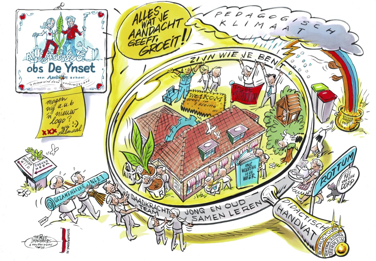 De Ynset is een gemoedelijke dorpsschool waar saamhorigheid aan de basis staat voor een prettig schoolklimaat. Samen creëren we een rustige, overzichtelijke en inspirerende leeromgeving waarin kinderen zich actief en gemotiveerd kunnen ontwikkelen. We leren ze respectvol te kijken naar en tolerant om te gaan met een ander en de wereld om ze zo voor te bereiden op hun huidige en toekomstige rol in de samenleving. Plezier is daarbij erg belangrijk, zowel voor de leerlingen als het team. We hechten daarom grote waarde aan een sterk pedagogisch klimaat waarin rust, regelmaat een duidelijke afspraken belangrijk zijn. We hebben hoge verwachtingen van onze leerlingen én van elkaar. We hebben de komende jaren een prachtig vooruitzicht: de nieuwbouw van onze school in het dorp. We grijpen daarbij de kans om onze visie op onderwijs te verscherpen en de kwaliteit van onderwijs te versterken. Onze nieuwe directeur is daarin de deskundige aanjager en weet ons te enthousiasmeren op een positieve manier. Samen de schouders eronder!